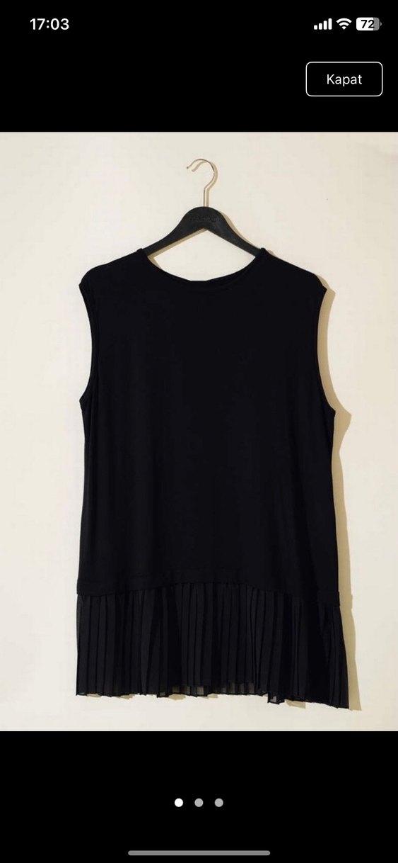 Siyah kolsuz yelek, bisiklet yaka ve pilili etek detayıyla midi boyda, bol kesimdir. Sentetik kumaştan yapılmıştır, günlük kullanıma uygundur.