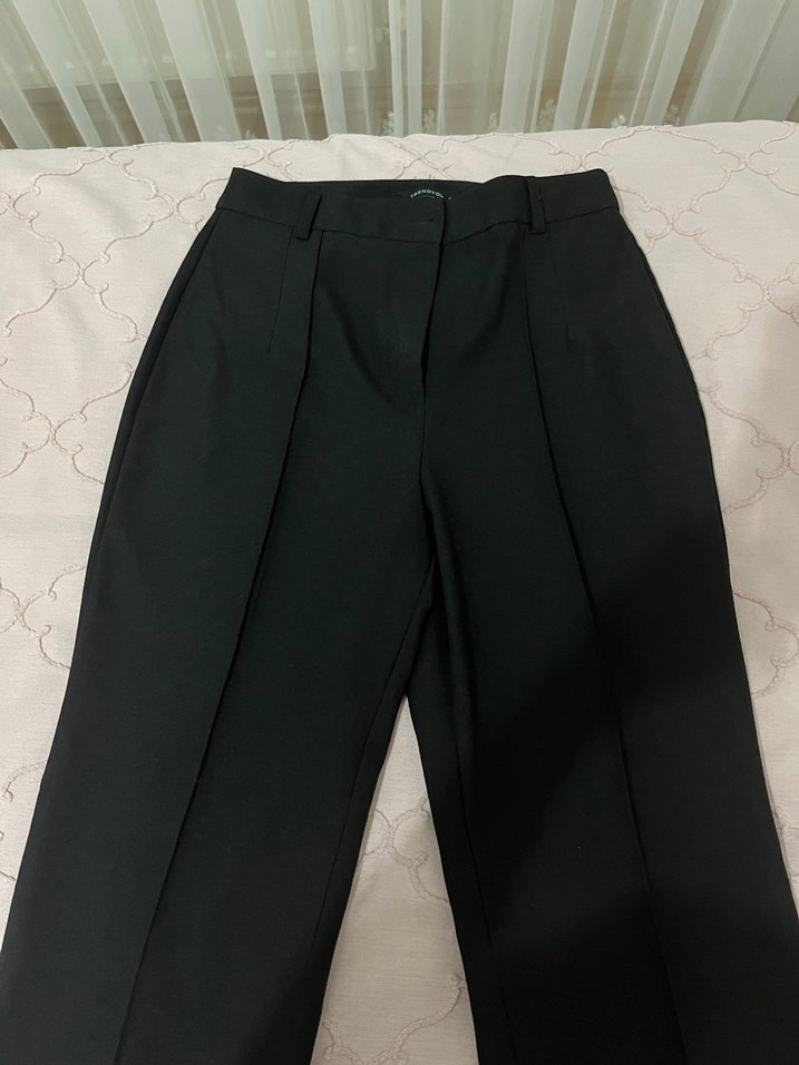 Kadınlar için siyah kumaş pantolon, normal kesim ve pilili tasarıma sahiptir. Midi boyda, iş ortamına uygun ve normcore tarzındadır. Synthetic kumaştan üretilmiştir.