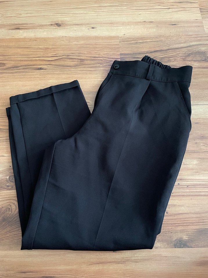 Kadın siyah kumaş pantolon, regular fit ve pilili detaylara sahiptir. Midi boyda, sentetik kumaştan üretilmiş olup, ofis ve iş ortamları için uygundur. Düz ve desensiz tasarımıyla temel, normcore stil sunar.