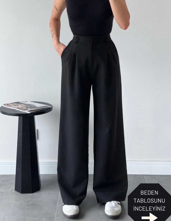 Kadın siyah kumaş pantolon, regular fit, pilili ve uzun boy. Ofis için uygun, düz ve desen içermeyen iş ve street wear tarzında.