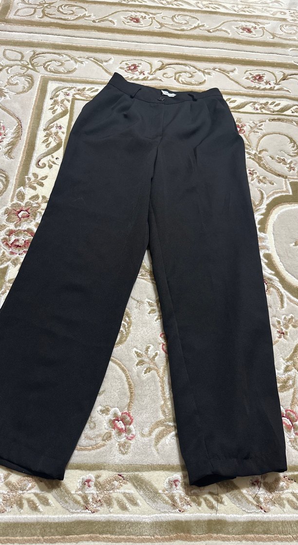 Düz siyah midi boy, regular fit, sentetik kumaştan kadın pantolon. Klasik ofis stili için pilili detaylı.