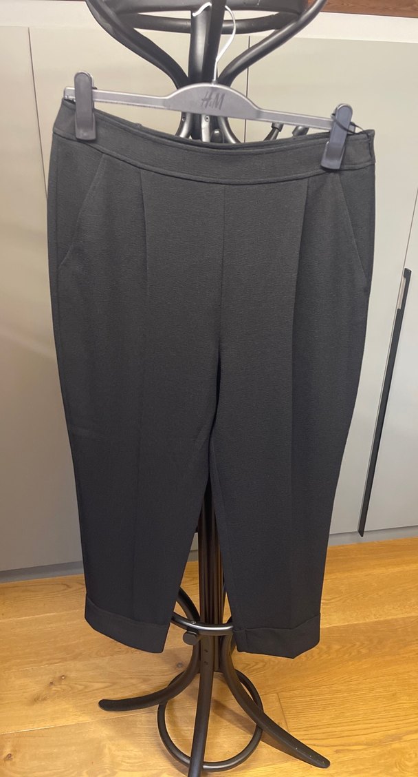 Kadınlar için siyah pilili kumaş pantolon, normal kesim ve midi boy. Düz, sentetik kumaştan yapılmış, ofis için uygun, çağdaş tarzda.