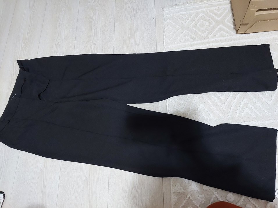 Kadınlar için siyah, normal boy, regular fit ve pilili kumaş pantolon. Minimalist tarzda, ofis kullanımı için uygundur.