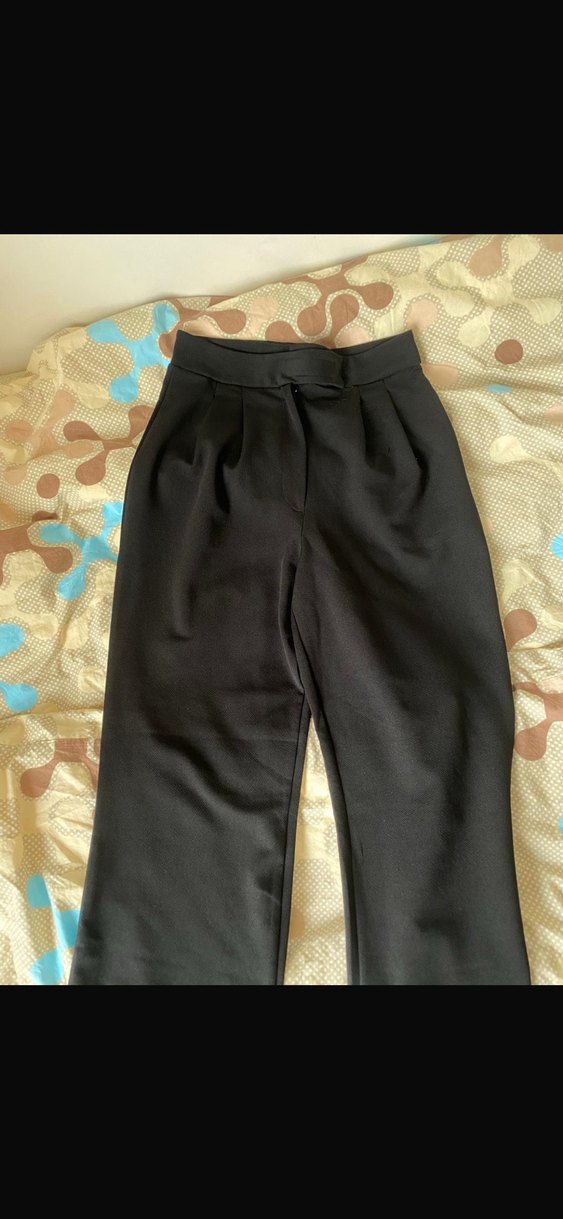 Kadın siyah pantolon, regular fit ve midi boyda, pilili detaylara sahip. Sentetik kumaştan üretilmiş, günlük ve iş stiline uygun. İki kere giydim cabuk tuylendi elimden cikarmak istiyorum
