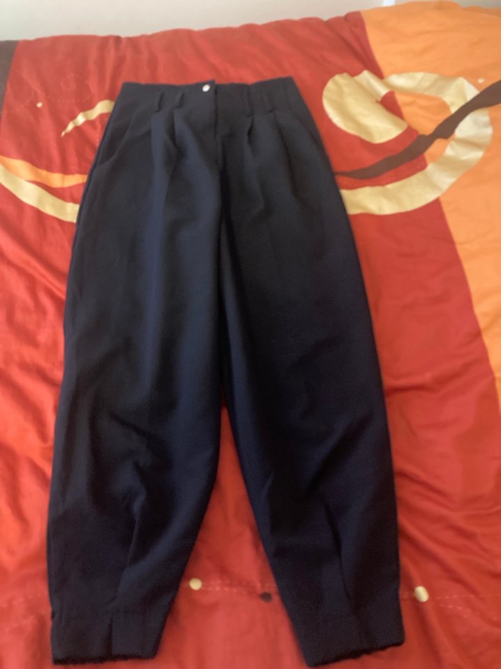 Siyah renkte, pilili ve salaş kesim midi boy kadın kumaş pantolon. Yumuşak sentetik kumaştan, günlük rahat stil için uygundur.