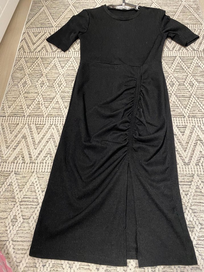 Kısa kollu, bisiklet yaka, pilili detaylara sahip siyah midi elbise.Günlük şık kullanıma uygundur.