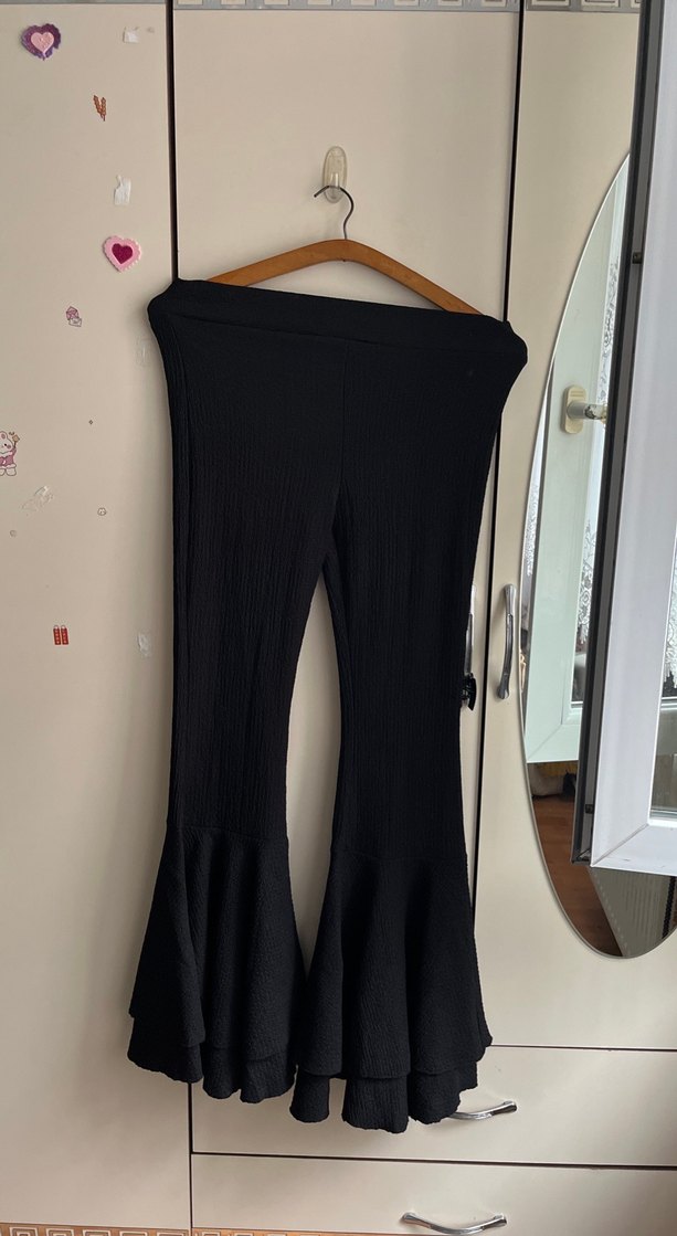 Pilili detaylara sahip, midi boy, siyah keten kumaştan yapılmış, fitted kesim İspanyol paça pantolon, gotik tarzda günlük kullanıma uygun.