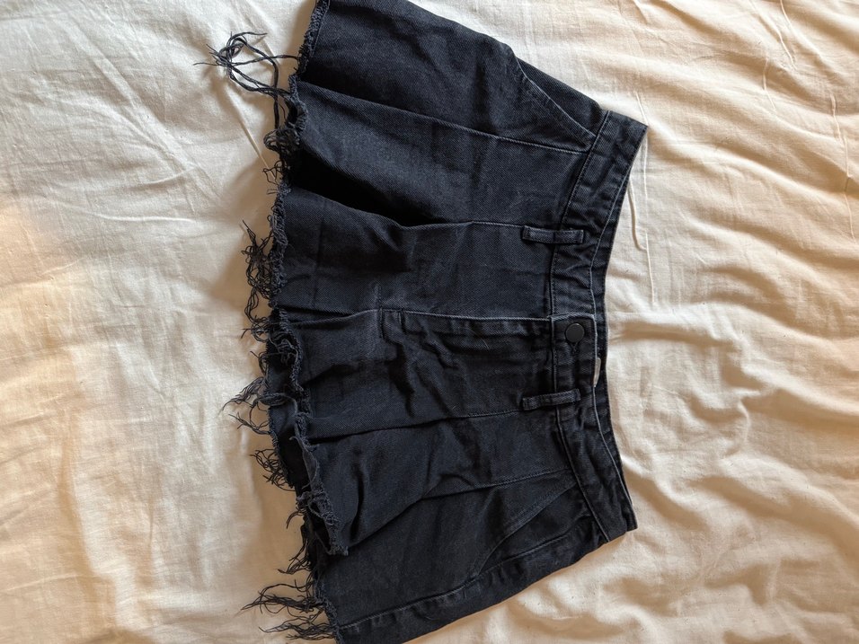 Siyah renk, pilili detaylı, bol kesim midi kot şort. Uçları püsküllü, desen içermeyen, günlük rahat sokak stili için uygun.
