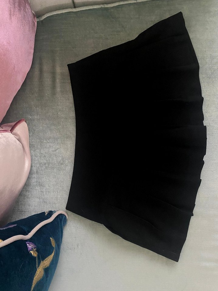 Düz siyah, pilili ve vücuda oturan mini etek, sentetik kumaştan yapılmıştır. tarzı dış mekan kullanımı için uygundur. ,içte şortu var.