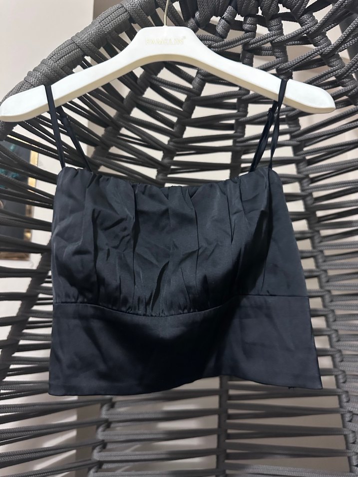 Kadın siyah, ince askılı, pilili detaylara sahip mini boy straplez büstiyer. Sentetik kumaştan, sokak stiline uygun dar kesim.