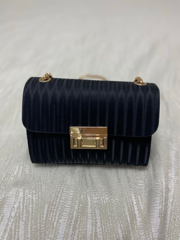 Kadınlar için siyah pilili sentetik kumaştan yapılmış, modern klasik tarzda çanta. Altın renkli toka ve zincir detaylarıyla günlük kullanıma uygundur.