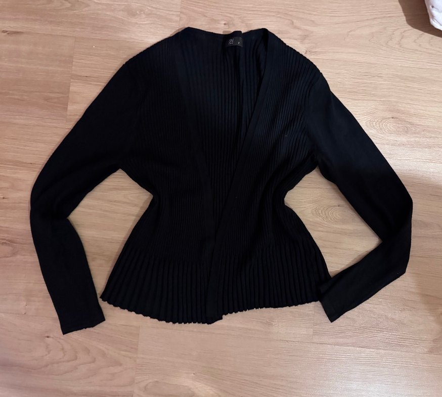 Kadınlar için pilili, siyah ofis hırkası. Keten kumaştan, uzun kollu ve normal midi boyunda, notched lapel yakalı, fitted kesim.