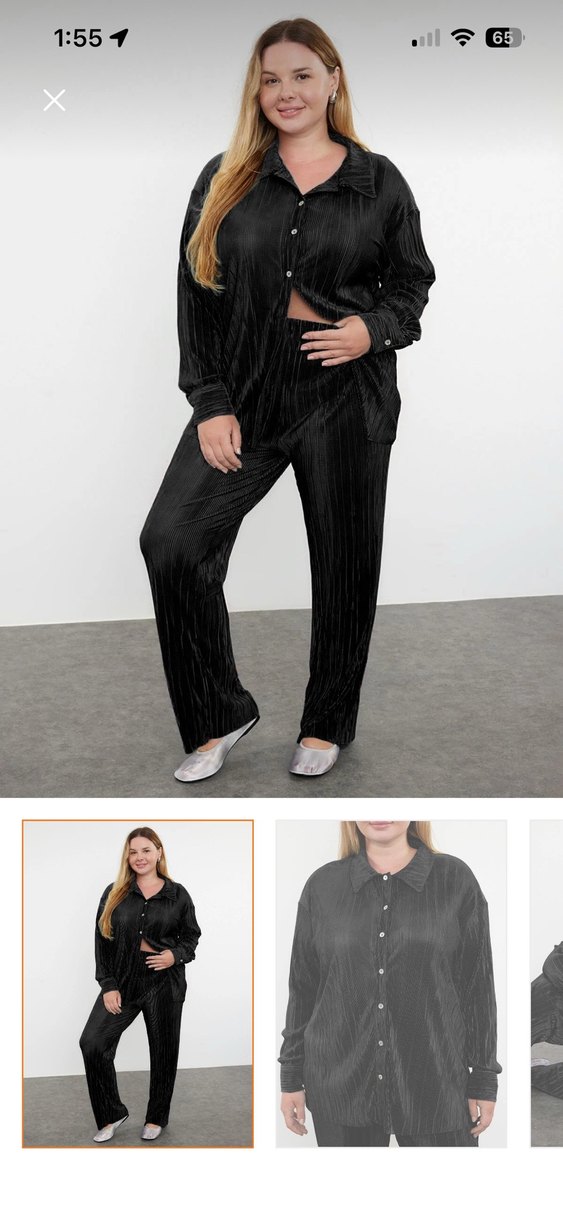 Kadın siyah pilili oversize takım, uzun kollu ve kesimli yakaya sahiptir. Sentetik kumaştan, athleisure ve streetwear tarzını birleştirir. Ofis veya günlük kullanım için uygundur.