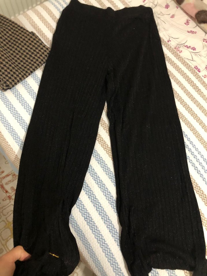 Siyah pilili kumaştan, salaş kesim ve midi boyda kadın pantolonu. Rahat ve şık sokak tarzı için uygun, günlük kullanıma ideal.