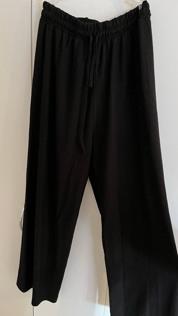 Kadınlar için siyah, pilili ve salaş kesim uzun kumaş pantolon. Yumuşak ve ipeksi dokusu günlük kullanıma uygundur.