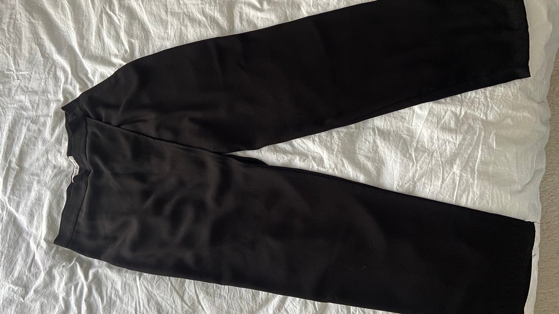 Kadınlar için siyah, saten kumaştan, pilili ve normal kesim midi boy pantolon. Minimalist ve normcore tarzıyla ofis kullanımı için uygundur.