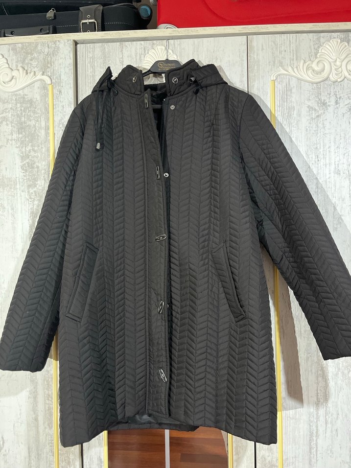 Kadın siyah uzun ceket, pilili tasarıma, kesik yakaya ve uzun kollara sahiptir. Rahat kalıplı, yumuşak sentetik kumaştan üretilmiştir, günlük kullanıma uygundur.