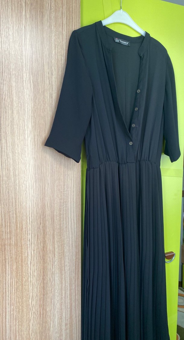 Kadınlar için siyah pilili uzun şifon elbise, kısa kollu ve yakası notched lapel. Rahat kesimli, sentetik dokulu kumaştan, ofis için uygun.