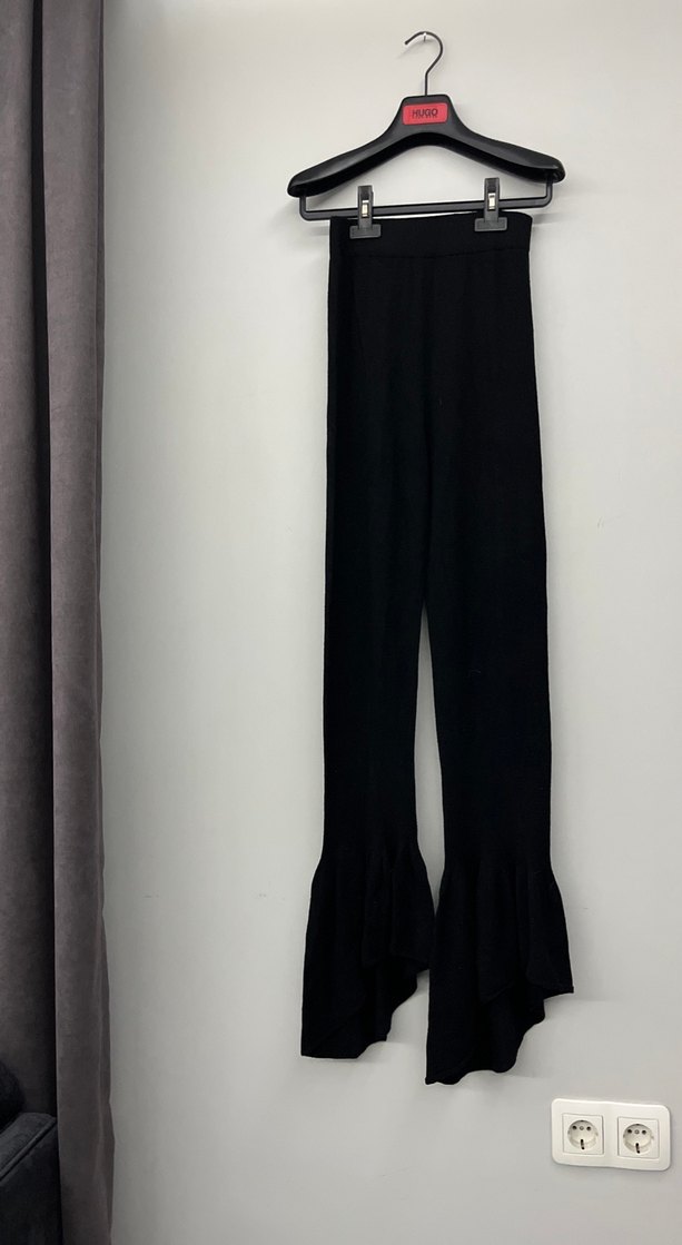 Siyah, pilili ve uzun ispanyol paça kesim pantolon, ince ve parlak dokusuyla ofis stiline uygun minimal gotik tasarım sunar.
