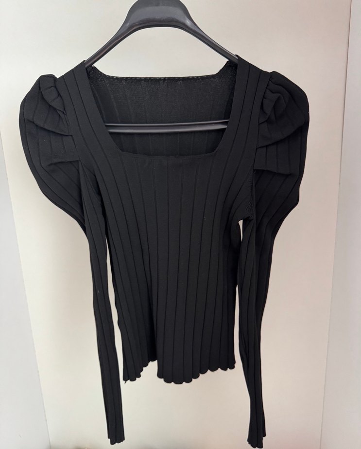 Uzun kollu, pilili ve kare yakalı siyah, ince kesim bluz. Sentetik kumaştan , şık ve modern bir tasarım.