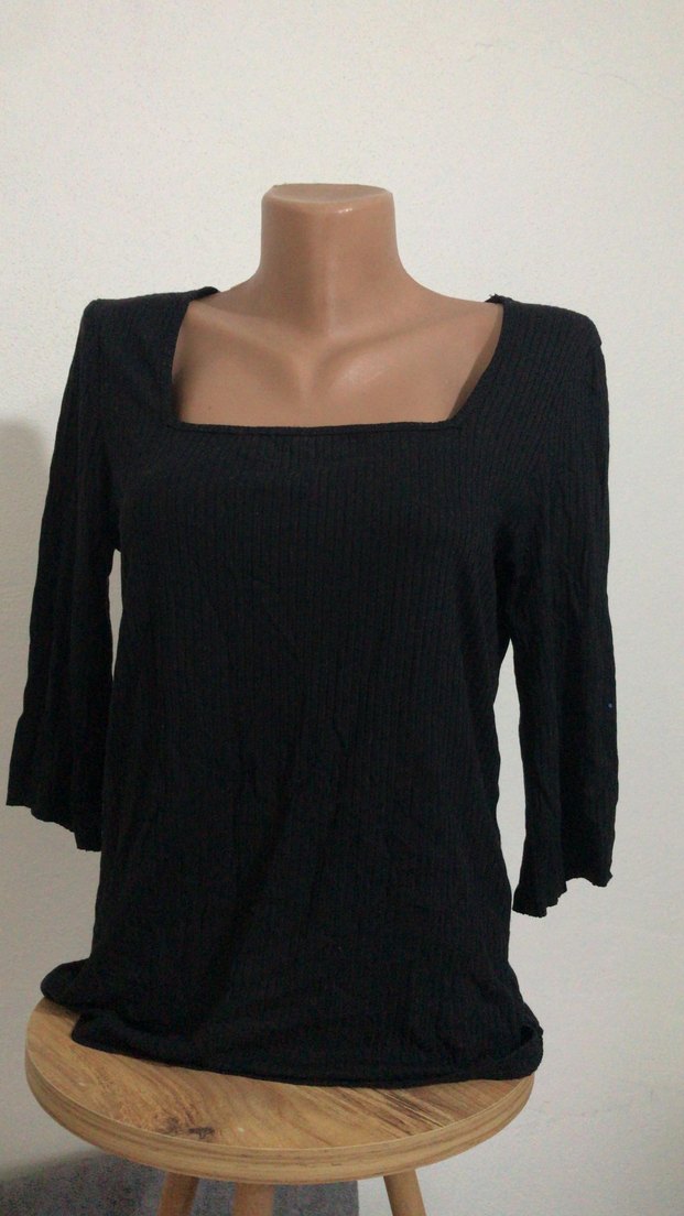 Siyah, kayık yaka ve uzun kollu, pilili detaylara sahip, rahat kesim kadın bluz. Nefes alan keten kumaştan yapılmıştır, trend günlük stile uygundur.