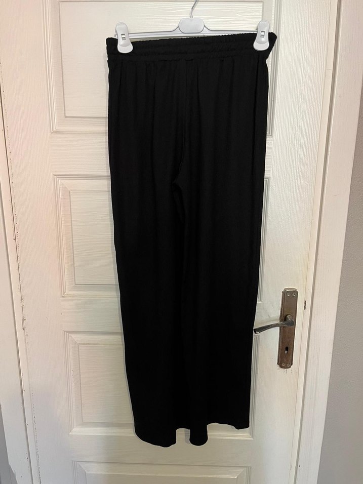 Kadınlar için siyah, ipeksi kumaştan, pilili ve bol kesim uzun pantolon. Minimalist goth tarzına uygun ve ofis kullanımı için ideal.