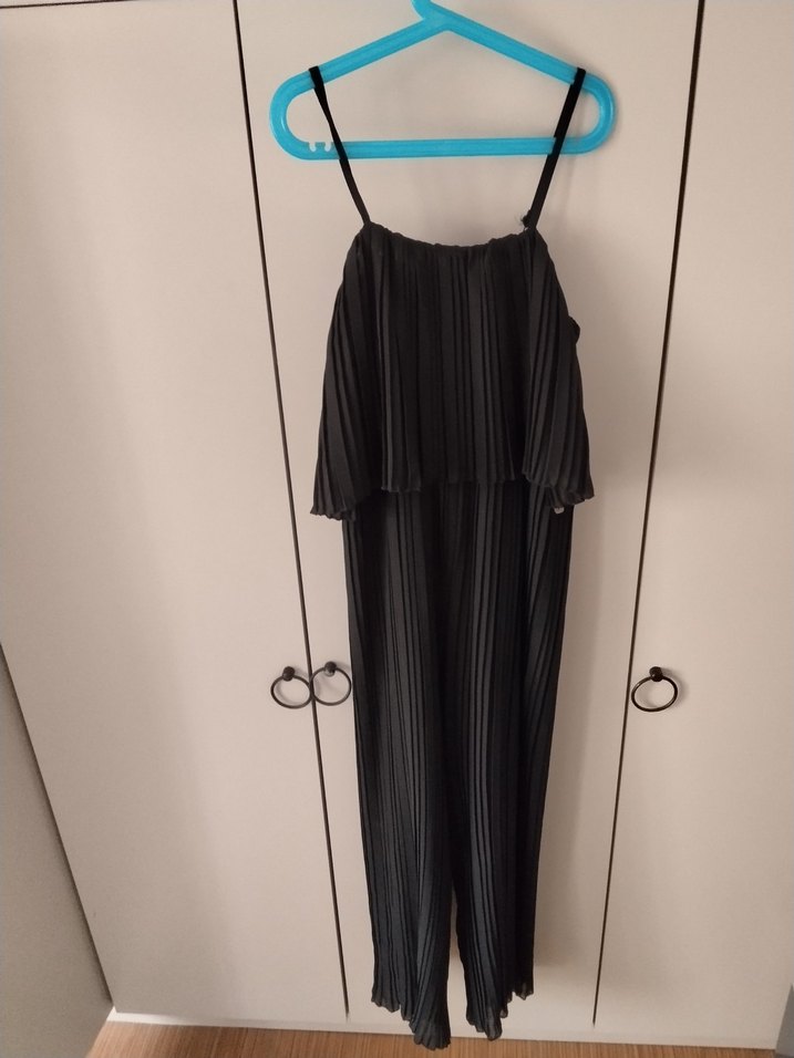 Siyah, ince askılı ve pilili sentetik kumaştan yapılmış uzun, straplez kadın tulumu. Rahat kesimiyle minimal ve şık bir görünüm sunar. ✨