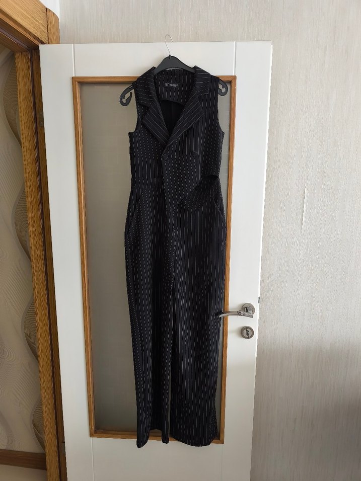 Notlu yaka ve pilili detaylara sahip siyah uzun tulum. Regular fit, kolsuz tasarım ve sentetik kumaştan, ofis için avant-garde tarzda.