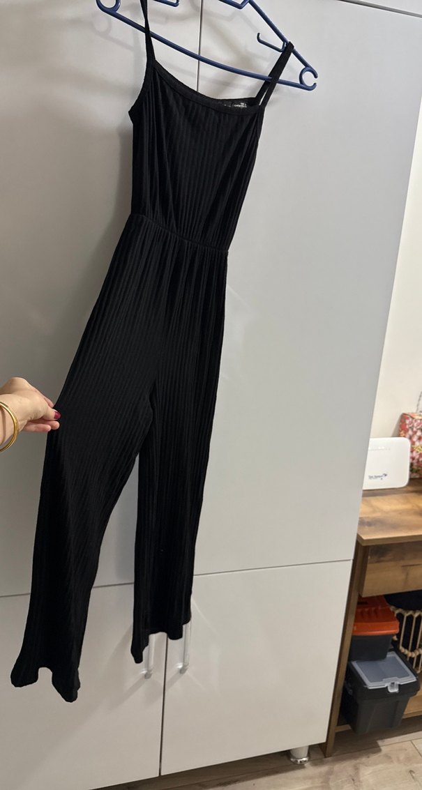 Siyah uzun tulum, pilili detaylı ve yüksek yakalıdır. İnce askılı ve sentetik kumaştan, minimalist ve şık bir günlük stil sunar.