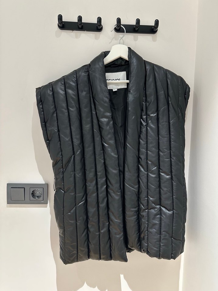 Yüksek yakalı, pilili tasarıma sahip siyah kolsuz yelek.