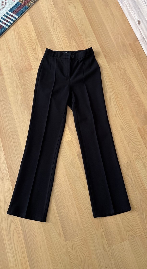 Düz siyah, piliseli kumaş pantolon. Normal boy midi kesim, rahat ve iş ortamına uygun tasarım. Ağ kısmı 3.fotoda görüldüğü gibi açılmaya başladı diktirip giyebikirsiniz