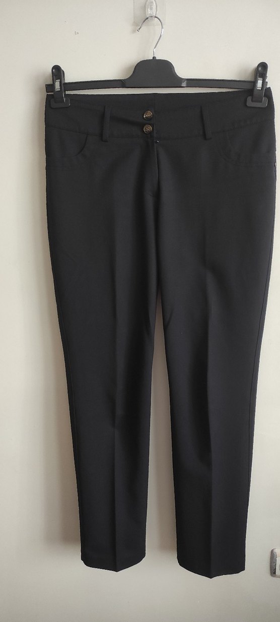 Kadınlar için lacivert pantolon. Düzenli kesim, sentetik kumaştan, ofis kullanımı için uygundur.
