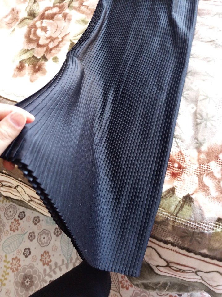 Uzun siyah kadın pantolon, piliseli sentetik kumaştan, normal kesim ve gündelik kullanıma uygun normcore tarzda.
