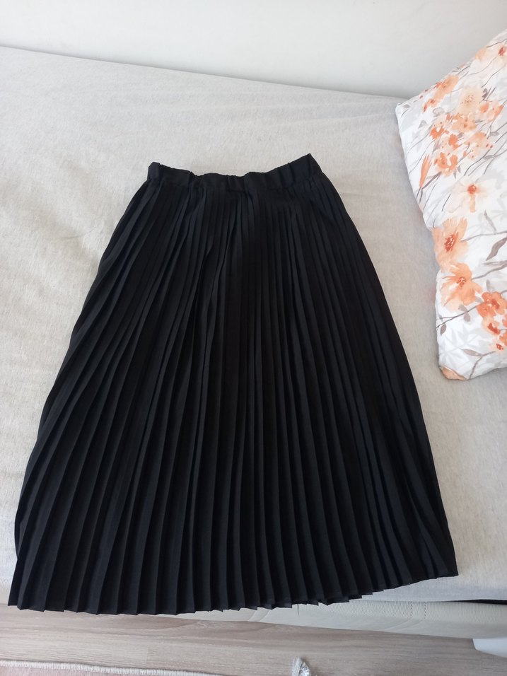 Siyah piliseli midi etek, sentetik kumaştan üretilmiş ve bol kesimlidir. Minimalist ve gotik tarz için uygun, sade tasarımıyla günlük kullanıma uygundur. M bedendir ama s veya xs daha rahat olur.