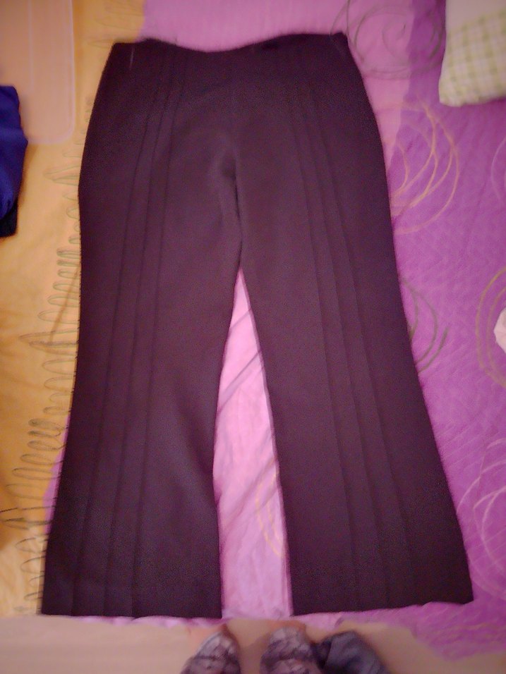 Kadınlar için siyah renkte, piliseli ve normal boyda, düzenli kesim kumaş pantolon. Ofis ve gündelik şıklık için uygun, ipeksi dokulu.