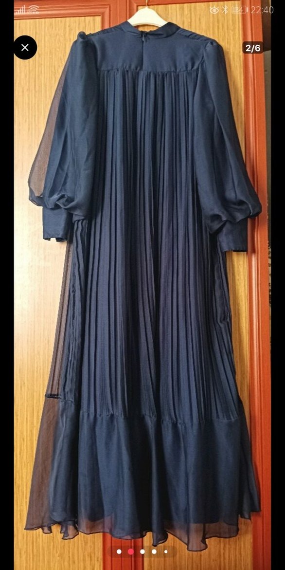 Bu siyah uzun elbise, yüksek yakalı ve uzun kollu, bol kesimdir. Sentetik kumaştan yapılmış, piliseli tasarıma sahiptir ve gotik stil ile düğün gibi özel günler için uygundur. Fabrikadan kaynaklı eteğin bilek kısmında ki tül yamuk kesilmiş. Şuanda satış fiyatı iki bin tek bir kez giydim. ACİL SATILIK.