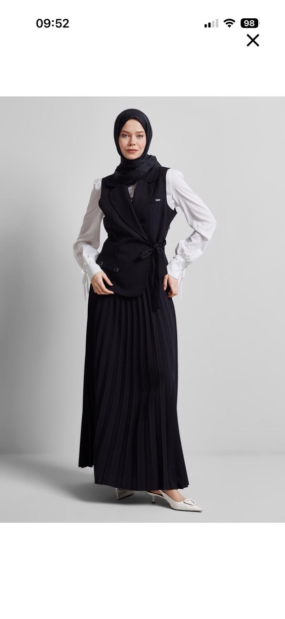 Kadınlar için siyah, piliseli uzun elbise, kolsuz ve yakası kesimli. Sentetik kumaştan, ofis için uygun, sade ve modest tarzda.