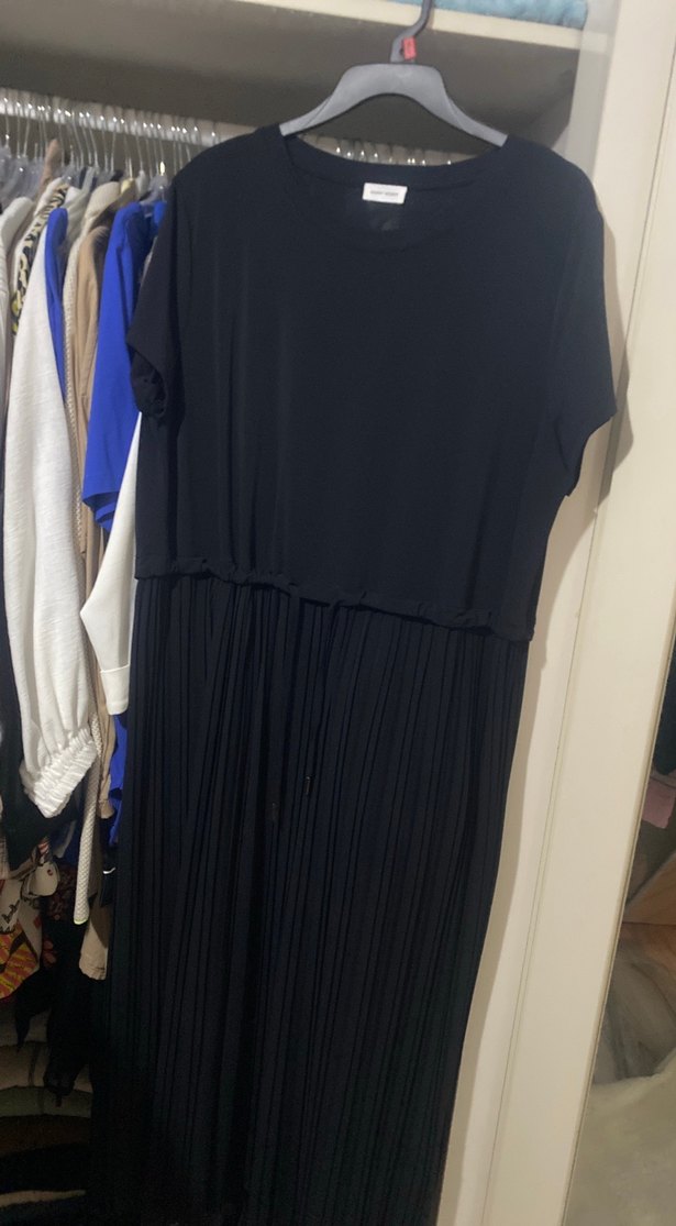 Siyah uzun elbise, kısa kollu ve yuvarlak yakalıdır. Sentetik kumaştan üretilmiş, piliseli etek kısmı ve bol kesimiyle günlük sokak modasına uygundur.