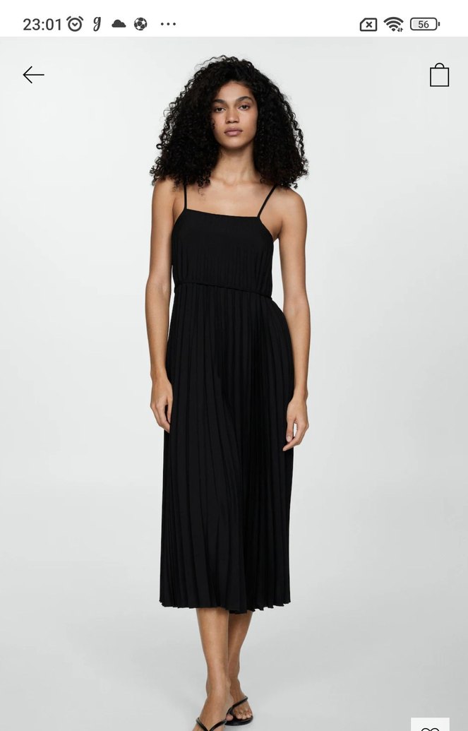 Siyah uzun elbise, ince askılı ve straplez yaka detayına sahiptir. Piliseli ve ipeksi dokulu, rahat kesimlidir. Romantik ve gotik tarzlara uygundur.