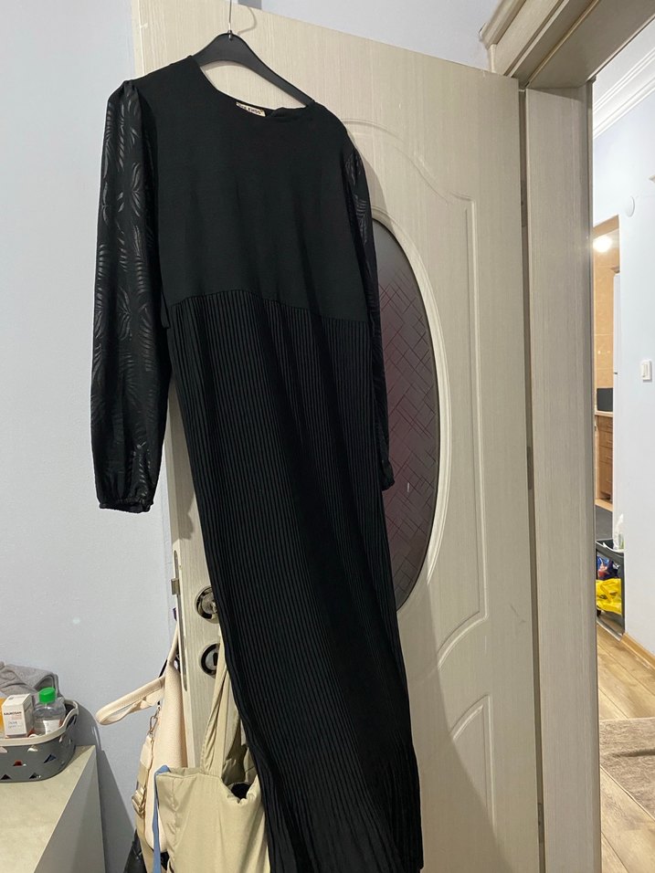 Siyah uzun elbise, piliseli detaylara, uzun kollara ve yuvarlak yakaya sahiptir. Sentetik kumaştan üretilmiş, günlük kullanıma uygun rahat kesimlidir.