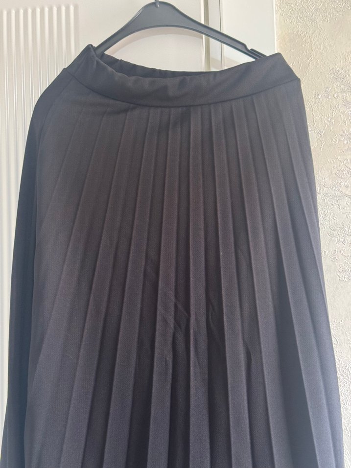 Siyah, piliseli uzun etek, sentetik kumaştan, bol kesim. Minimalist goth tarzına uygun, günlük kullanıma ideal.
