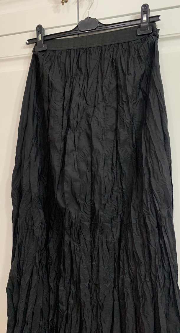 Kadınlar için siyah keten kumaştan, piliseli ve bol kesim uzun etek. Günlük kullanım için gotik tarzda.