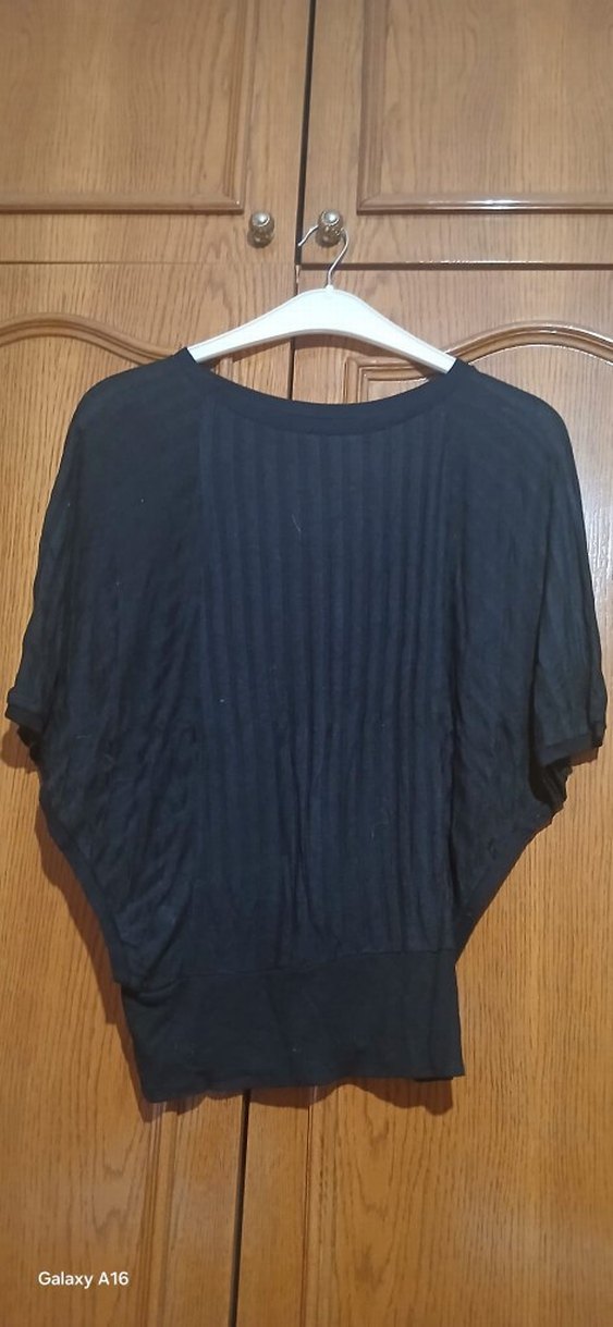 piliseli detaylı, yuvarlak yaka ve bol kesim siyah kadın kazak. Kısa kollu ve günlük rahat goth tarzı için uygun.