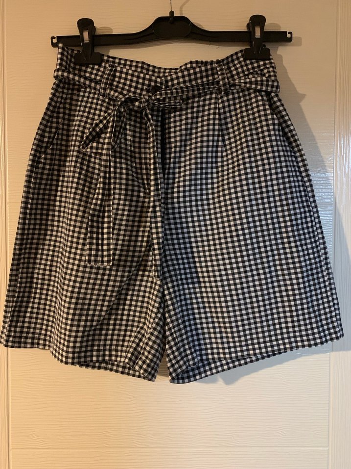 Kadınlar için pamuklu, siyah kareli, kemerli ve bol kesim kısa bermuda şort, günlük sokak stili için uygundur.