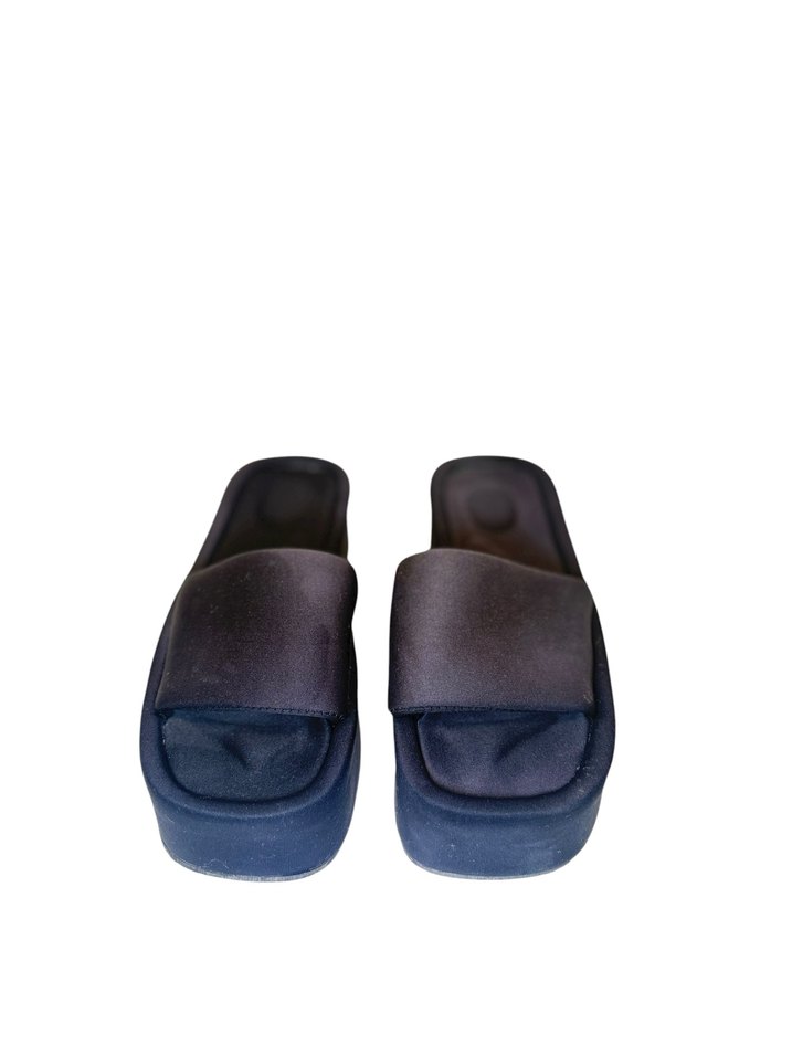Siyah platform tabanlı, kauçuk malzemeden yapılmış, desen içermeyen minimalist kadın terliği. Günlük kullanım için rahat ve şık. Topuk 5 cm ve üzeri