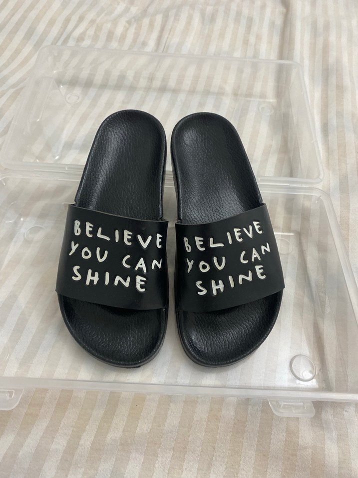 Siyah parlak kauçuk malzemeden yapılmış, tokalı ve baskılı yazılı bantlı kadın platform terlik. Minimalist ve rock punk tarzına uygundur. ✨