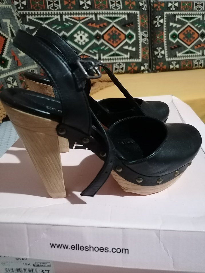 Siyah platform topuklu ayakkabı, kayışlı ve desenli kauçuk malzeme ile bohem ve sokak stilini bir araya getirir. Günlük kullanıma uygundur.