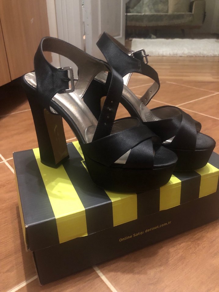 Siyah platform topuklu, tokalı gece ayakkabısı. Cesur ve çağdaş tasarıma sahip, romantik akşamlar için uygun. Satendir. 1 defa kullanıldı.