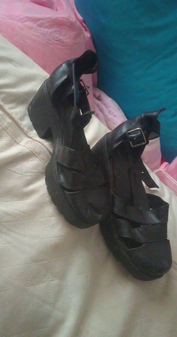 Siyah platform topuklu, tokalı kayışlara sahip, kauçuk malzemeden yapılmış goth tarzı ayakkabılar. Günlük kullanıma uygun, trend ve avangart tasarım.