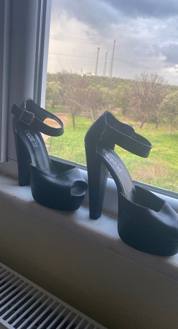 Siyah platform topuklu, tokalı bantlı, ucu açık ayakkabı boyamak istiyor bir süre kullandım deformeler var ama çok rahat ayakkabı 13cm topuk boyu